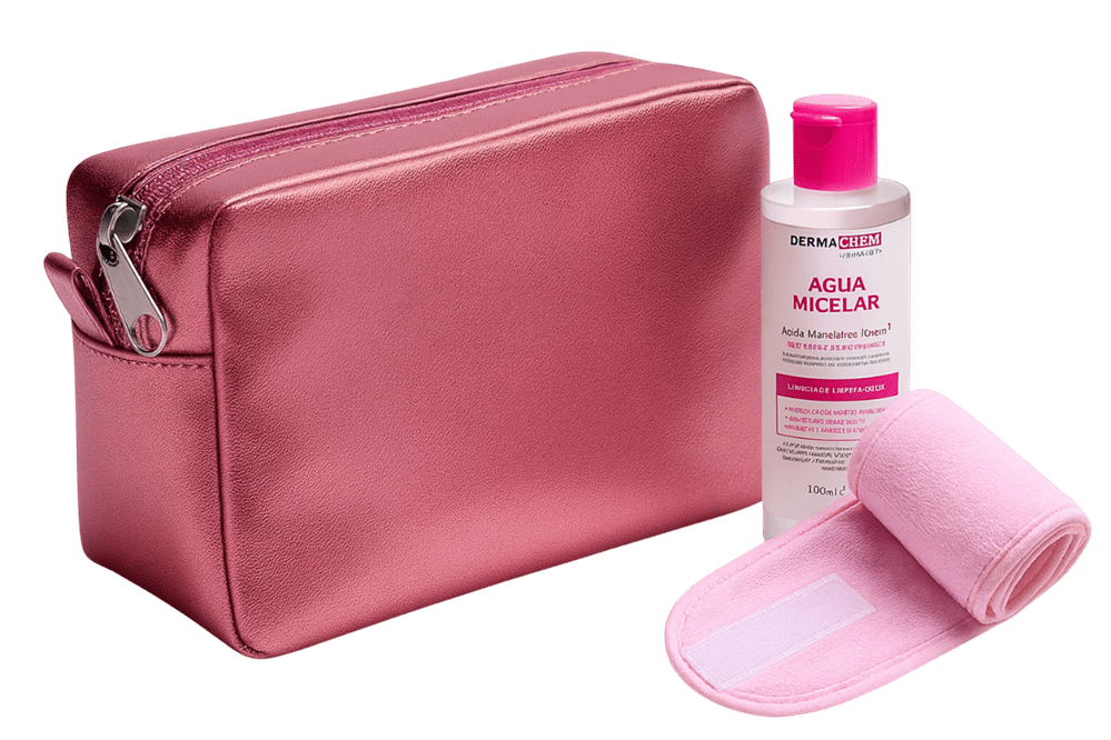 Kit de beleza com bolsa de cosméticos, água micelar e faixa para cabelo. Presente útil e elegante para ações corporativas e campanhas femininas.