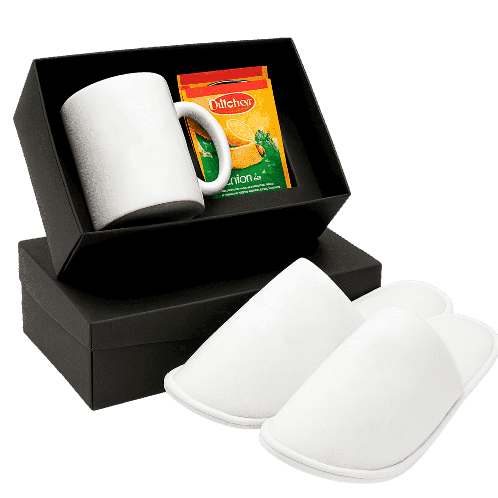 Kit com caneca personalizada, 3 sachês de chá Dr. Oetker, chinelos de quarto unissex e caixa duplex. Brinde aconchegante e funcional para ações corporativas.