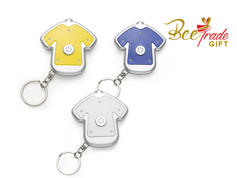 Chaveiro de plástico com lanterna em formato de camiseta colorida com contorno prata.