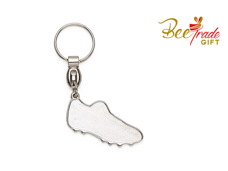 Chaveiro de metal em formato de chuteira, frente e verso lisos.