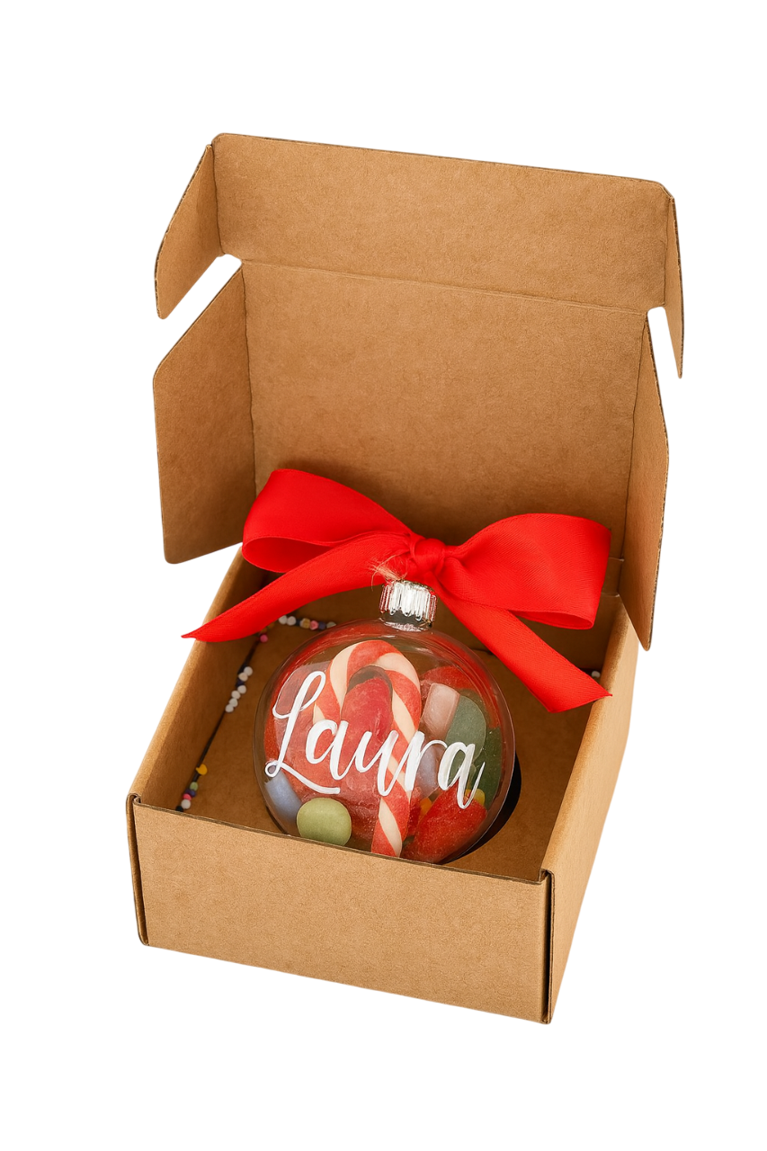 Cada bolinha vem recheada com doces variados — jujubas, balinhas ou confeitos coloridos — e pode ser pendurada na árvore de Natal, usada como brinde corporativo criativo ou lembrança personalizada em ações de fim de ano.