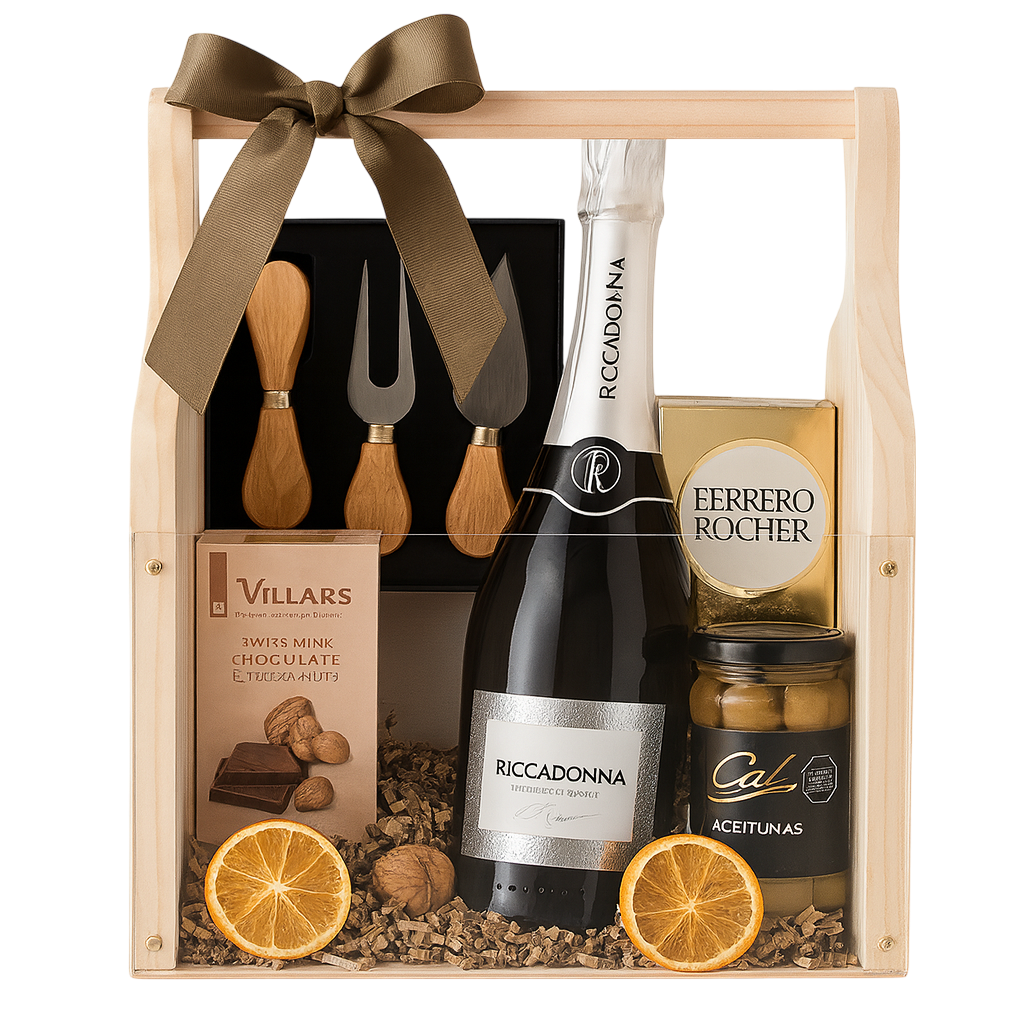 O Kit Natalino Celebration – Espumante & Delícias Gourmet combina o brilho do espumante com o charme do kit queijo, a doçura do Ferrero Rocher e do chocolate, e o toque refinado das azeitonas.