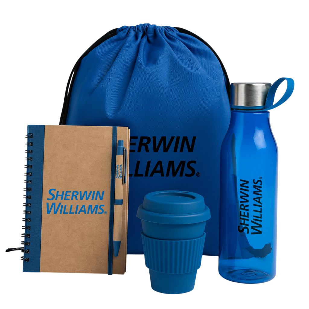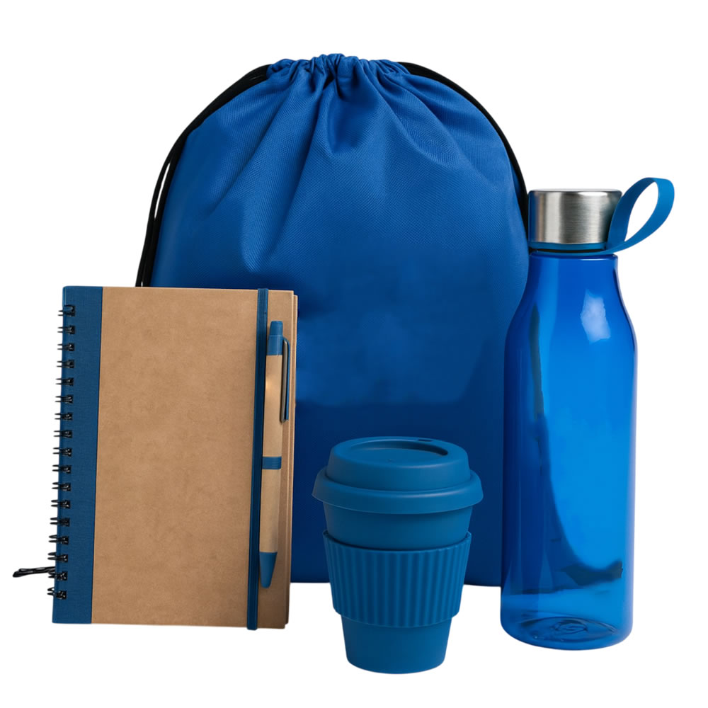 Kit onboarding com sacochila leve, copo de viagem, garrafa plástica reutilizável, agenda e caneta. Ideal para integração leve, prática e sustentável.